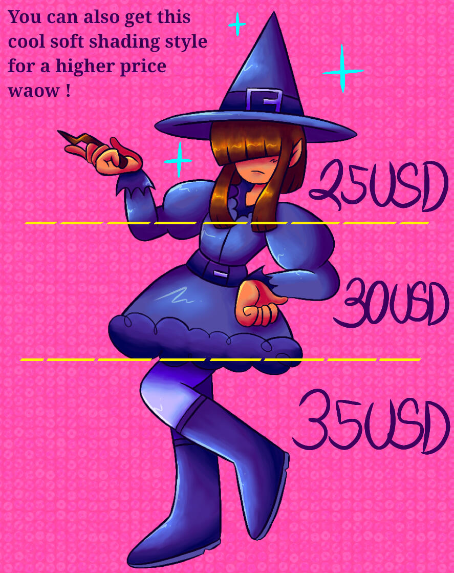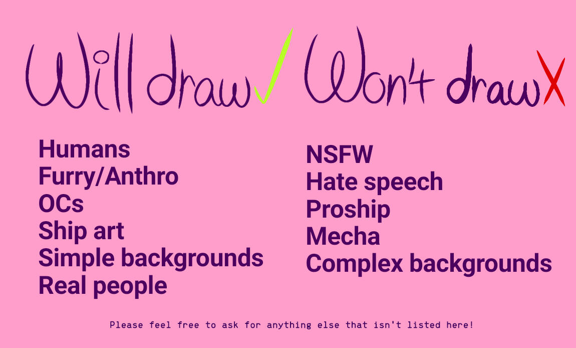 • I have the right to decline any commission request i'm not comfortable with.• Let me know beforehand if you don't want your commission to be posted/shared anywhere on my account. Other than that I will post any and all commissions I make for advertising purposes (will be watermarked).